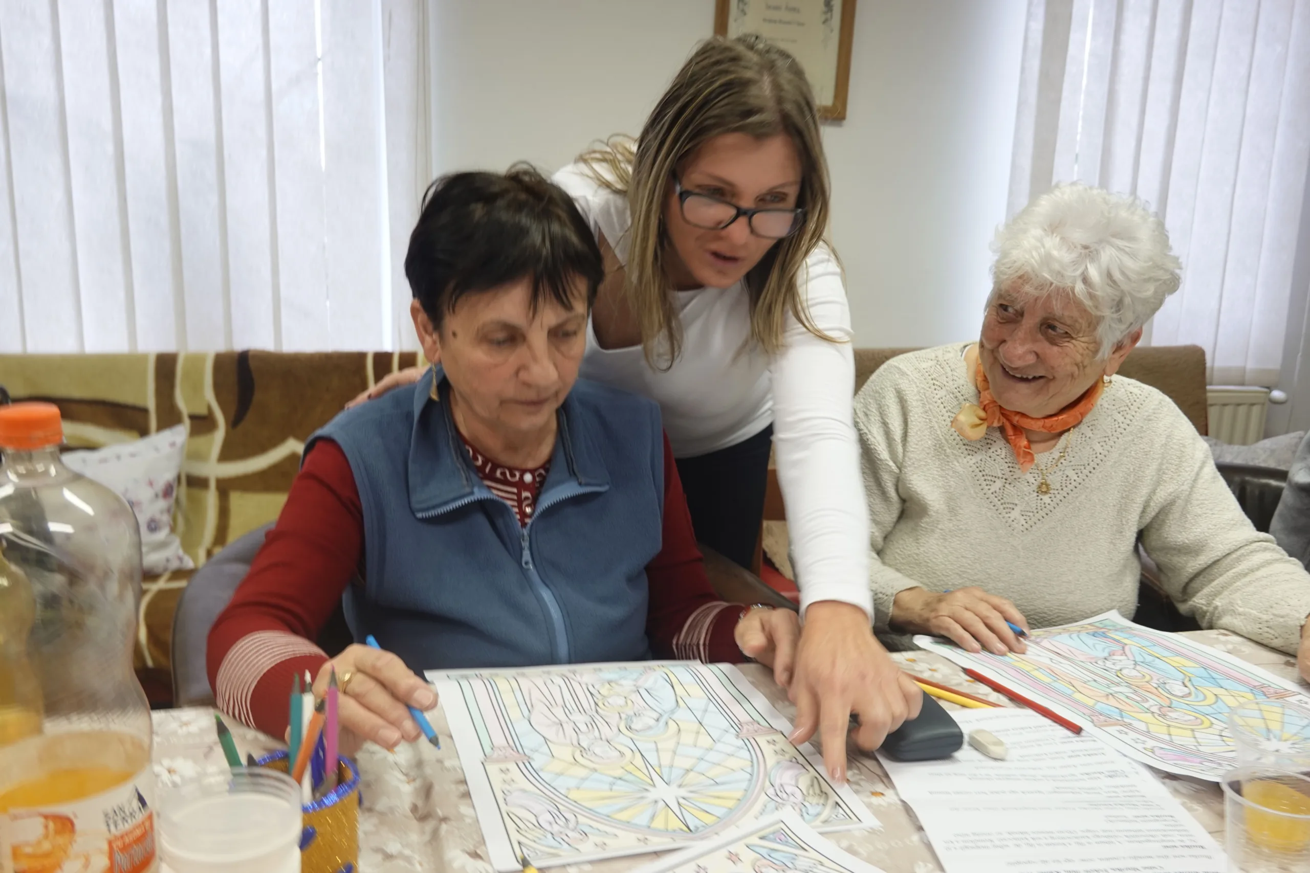 A mozgásról sem feledkeznek meg: ülve végezhető, biztonságos tornát tartanak, mindenki a saját állapotához igazodva. A gondozónők folyamatosan figyelik az idősek egészségi állapotát, ami a családtagok számára is megnyugtató.